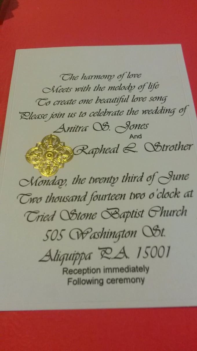 I will design invitations for any occasion: Weddings, parties of any kind, birth or other announcements of any type. Custom orders are always welcomed! Please contact me with any details before placing an order. Thanks!Reviews