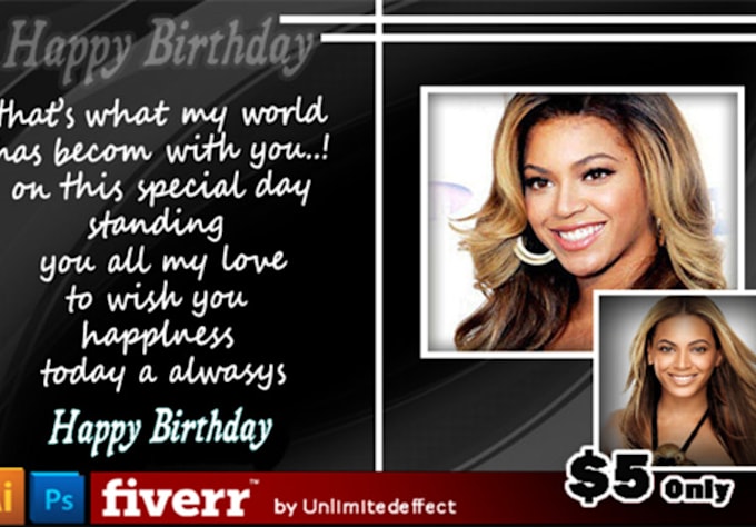 (2 HOURS EXPRESS DELIVERY IS NOW AVAILABLE FOR EXTRA $50)As an expert in graphics design field I can create you a BIRTHDAY WISHING CARD,GREETING CARD,INVITATION CARD OR ANNIVERSARY CARD.I will design the cards according to your preferences.I can deliver your order within 24 hours.100% BUYER SATISFACTION IS GUARANTEED.So use the maximum use of my talent and experience to make your loved ones and moments HAPPY